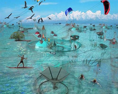 András Győrfi’s “The Swimming City” was the winner of the first design contest held in 2009 by The Seasteading Institute, an organization that aims to create permanent, stationary structures where new ideas for government can be tested. Győrfi describes his winning design as a “mixed-use community,” which features a swimming pool, amphitheater, helicopter landing pad and shaded marina.