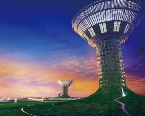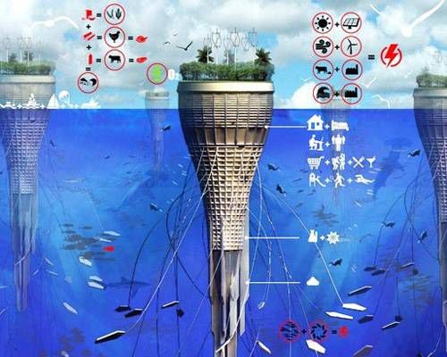 Shimizu, a Japanese technology company, designed the Green Float concept to be self-sufficient and carbon-negative, allowing mankind to live harmoniously with nature. Each floating cell district has a radius of .62 miles that can house 10,000 to 50,000 people. Joining these districts would form a city of 100,000, and a group of modules would constitute a country. The towers in the center of each district are structured with residences and hospitals at the periphery, offices and commercial facilities in the center, and plants growing along the tower. Carbon dioxide and wastewater from the urban areas become nutrients for the plants, and grains, livestock and fish live along the base and ocean shallows of the tower. Green Float is powered via solar energy, ocean thermal energy conversion and wind and wave technologies, and such cities would be located along the equator where the climate is stable and not prone to hurricanes.