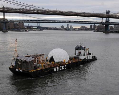 Artist Mary Mattingly envisioned Waterpod as an alternative living model that could be re-created in the future when land and resources are scarce. Built out of recyclables upon a rented barge, the Waterpod runs on solar power, and its crew grows its own food and collects rainwater. Food comes from chickens and gardening, waste is composted, and residents sleep in small quarters built from reclaimed materials. Mattingly and the Waterpod project team say the self-sustaining space might offer a glimpse into the future when mankind lives in mobile aquatic shelters that make up water-based communi