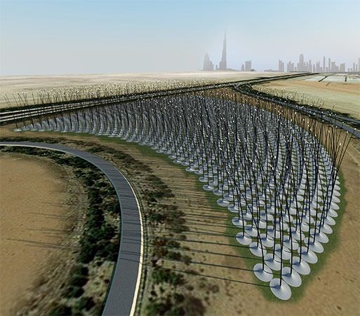 Windstalk: Within each hollow pole is a stack of piezoelectric ceramic discs. Between the ceramic disks are electrodes. Every other electrode is connected to each other by a cable that reaches from top to bottom of each pole. One cable connects the even electrodes, and another cable connects the odd ones. When the wind sways the poles, the stack of piezoelectric disks is forced into compression, thus generating a current through the electrodes.