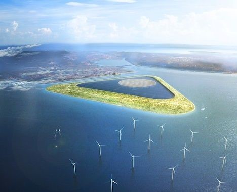 Manmade Island Wind Battery Concept: The Green Power Island makes use of pumped hydro, a storage strategy that’s already in wide use. Conventional pumped hydro systems use vertically separated reservoirs to utilize the power of water and gravity; during times of low demand (off peak), water is pumped using excess energy from the lower to the upper reservoir. As demand increases, the water is allowed to flow downhill into the lower reservoir, generating electricity in the process.
