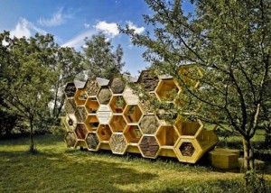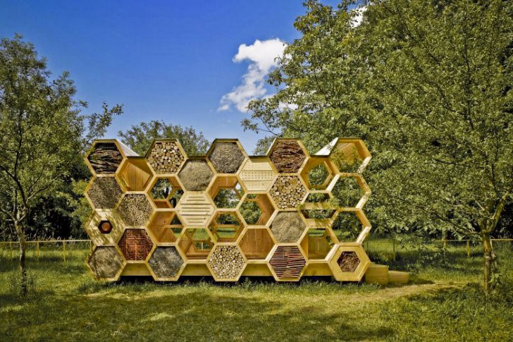 In the creation and support of resilient ecosystems, the design of human structures and shelter certainly has a significant role to play. Designers can minimize impacts on the site or integrate wildlife habitat in their work. French firm AtelierD takes the latter approach with their K-abeilles Hotel for Bees, a hexagonally gridded pavilion that provides niches for wild bees to inhabit, while also integrating a covered seating area for humans brave enough to sit in the middle of all that apiarian action.