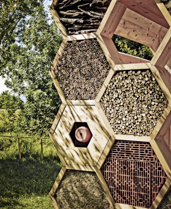 Created for last fall’s Muttersholtz Archi<20 Festival, the Hotel for Bees is a 20 square-meter wooden outdoor pavilion that features a honeycomb-shaped configuration. The openings can be filled with twigs, straw, reeds, bark and various foraged materials in order to attract wild pollinators into building their habitats within.