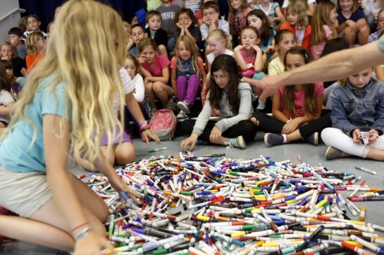 Third grade student Hannah Knudsen, left, helps Land Wilson spread out 33 pounds of Crayola markers for a group picture at the Sun Valley Elementary School in San Rafael, Calif. on June 6, 2013.