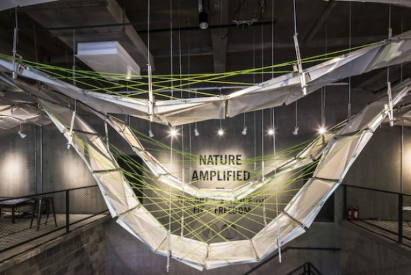 “One thousand translucent origami RiceFOLD ceiling panels are made from 50,000 recycled DVDs from greater China, reinforced with Rice Husk SiO2 (natural organic mechanical strengthening additive),” reports Environmental Leader. “The 2,000 yards of tension cables are made from 2,000 post-consumer recycled water bottles from greater China, also reinforced with Rice Husk SiO2. The 1,000 connection joints are made from 5,278 aluminum cans from greater China.”