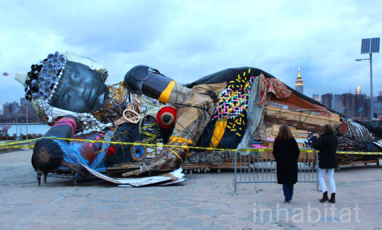 Queen Mother of Reality” is a 50-foot-long form that at first glance resembles a reclining deity like one you might see in Asia. Take a closer look though and you’ll find that the Buddha-like figure has an umbrella for an elbow, gold electronics for a necklace and a nipple made out of a bushel. The enormous statue was also designed with an open back that acts as an inner room symbolizing a temporary shelter for the evicted mothers of New York. Althamer modeled the piece after Queen Mother Dr. Delois Blakely, an influential figure in Harlem who has been recognized for her social justice work in the community.