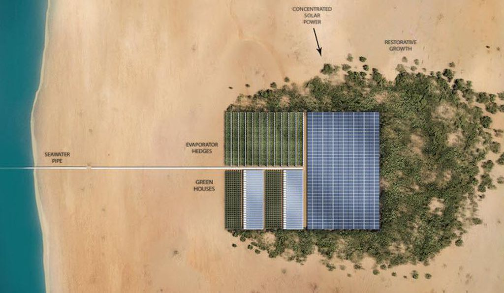 Seawater is piped to a concentrated solar power plant that powers an evaporative desalination system. The distilled water is used to irrigate plants. (Sahara Forest Project)