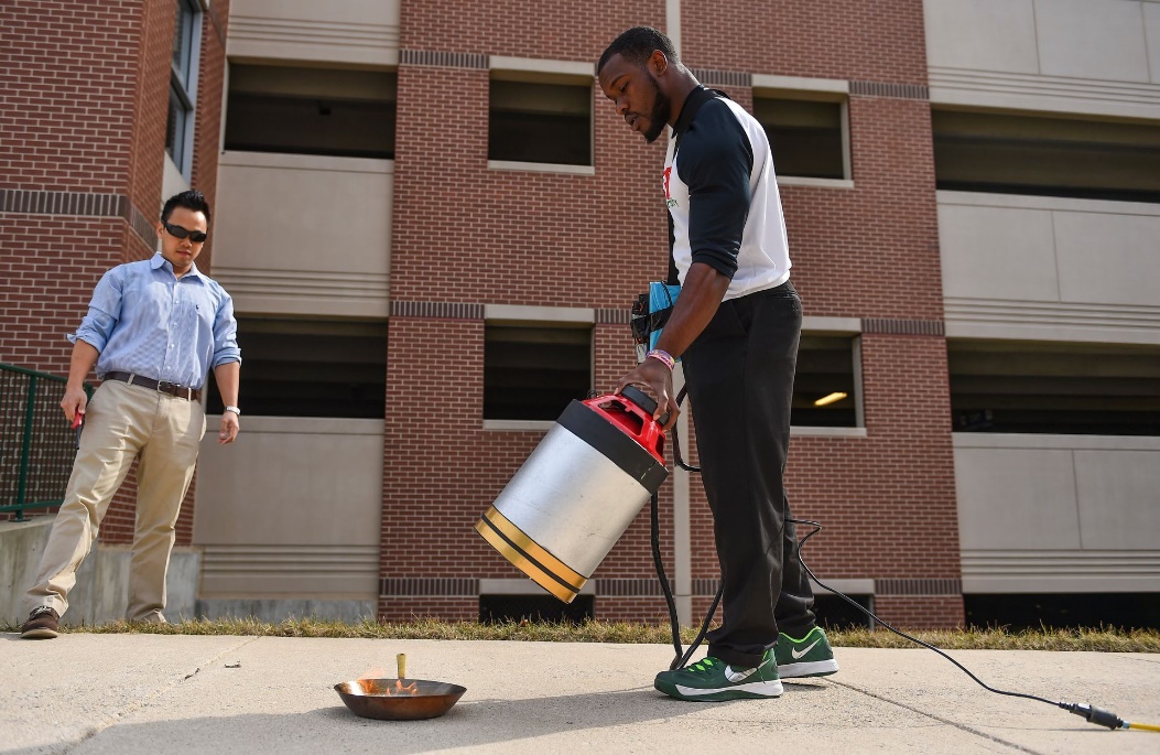 Senior electrical engineering students Viet Tran, left, and Seth Robertson, demonstrate extinguishing a fire with their wave extinguisher. (Ricky Carioti/The Washington Post)