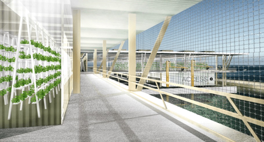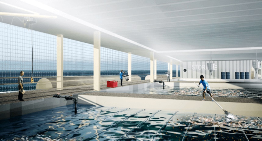 Lastly, the ground level is designated for offshore aquaculture. According to the designers, this cage fishing method takes place in the open sea and eliminates the exposure to wind and waves.