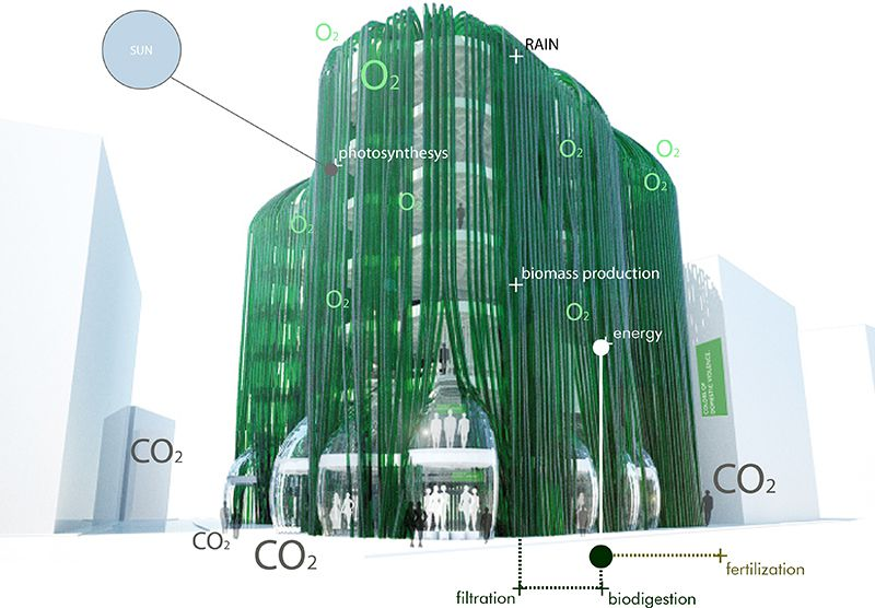 The team at ecoLogicStudio has been working on the technology for six years. They’ve consulted with a network of experts, including microbiologists, agronomists, ETFE manufacturers and computer systems engineers. Currently, the ETFE-algae structures cost about 1,200 euros (about $1,308) to build, though the price will likely drop as the technology advances. Poletto hopes to implement the technology on a much larger scale in the future. Ultimately, entire buildings could be clad in algae-filled ETFE. These green “skins” would provide shade, give off oxygen and produce food or biofuel. EcoLogicStudio has created a digital rendering of a multi-story building; Poletto says they’re in talks with various partners to make this a reality down the road.