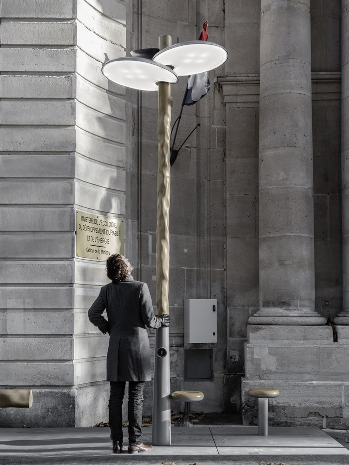 Clover was installed in front of the Ministère de l’Écologie to coincide with COP21, the United Nations Conference on Climate Change, which took place in December. This is not the first time that Lehanneur, who is also the chief designer for Chinese telecommunications company Huawei, has made life easier for busy urbanites. In 2012 he installed covered Wi-Fi access stations—complete with seating and a green roof—at the Rond Point des Champs-Élysées.