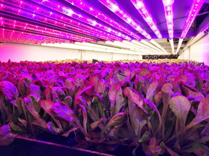 Alexander C. Kaufman/The Huffington Post. Heads of red romaine lettuce are seen in their final stage of growth at Aerofarms’ growing facility in Newark.