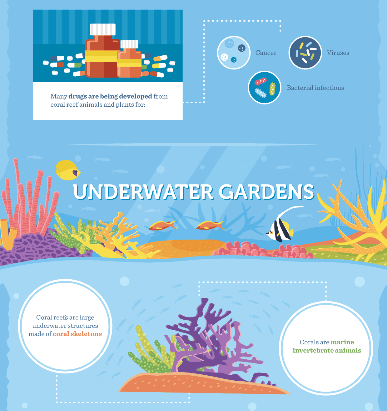 Coral reefs are incredibly important to the diversity and health of our oceans. Making up only 0.2 percent of our oceans, but containing around a quarter of all marine fish species, coral reefs are second only to rainforests in biodiversity of species. Coral reefs serve as nurseries for growing fish, protect shorelines from erosion, provide food for coastal communities, and are a vital source of tourism income for countless communities. There are potentially millions of undiscovered species living amidst our coral reefs, and many major cancer- and virus-fighting drugs are being developed from coral reef animals and plants.