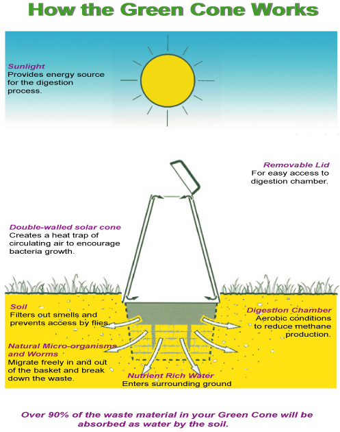 The Green Cone has double walls that heat up in the sun, cycling oxygen to the chamber below that is humid and connected to the surrounding soil, and speeding up the breakdown process. When the weather is warm, the Green Cone can handle 1 kg/2 lbs of kitchen waste per day, although this slows in winter, at which point you can add an optional accelerator powder. Surprisingly, the Green Cone’s list of digestible items includes meat, bones, grease, dairy products, seafood, even small amounts of animal excrement.