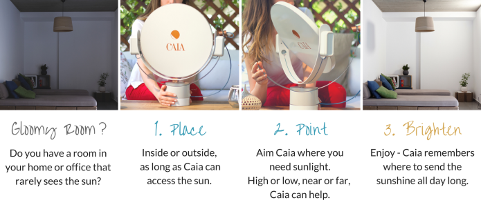 Caia is a smart natural lighting robot that brightens up your home with real sunlight, sending the sun where you need it most – all day long.