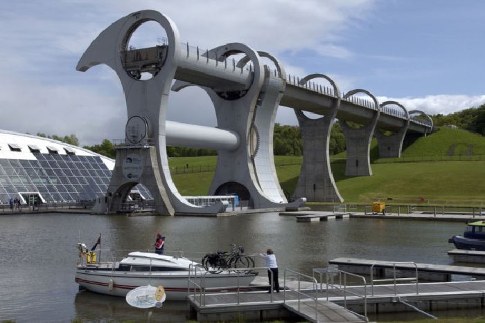 A marvel of Scottish engineering, the Falkirk Wheel in central Scotland, completed in 2002, is known as the world’s first and only rotating boat lift.