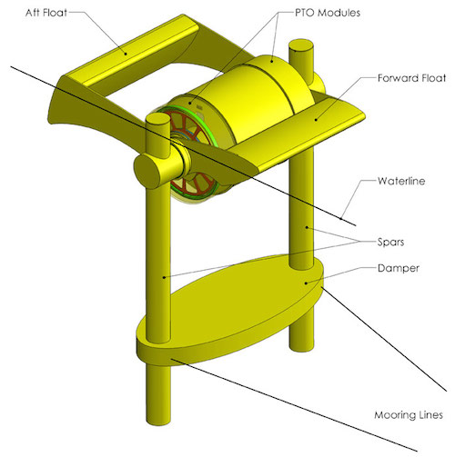 As described by Columbia Power, the “float” and “spar” parts of the device each react differently to the shape of passing waves and swells: