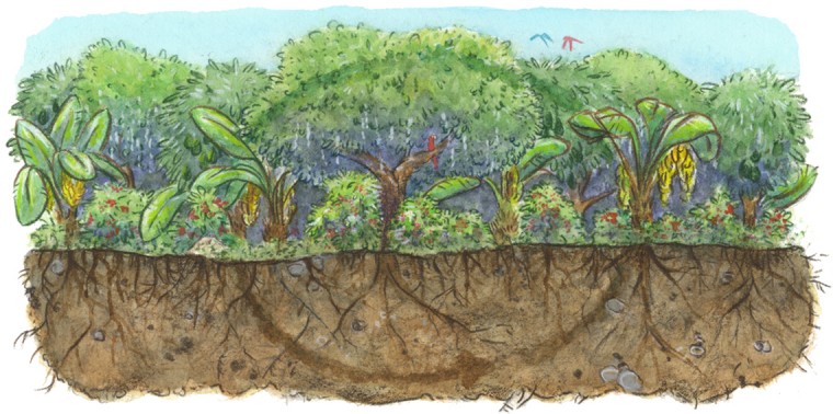 Ricardo Romero of Las Cañadas, the small cooperative described above, is working to develop food production systems that provide a complete diet while incorporating as much of the ecosystem function of the cloud forest as possible. Such systems could also serve as corridors to reconnect fragments of intact forest. And it could do all this while sequestering impressive amounts of carbon.