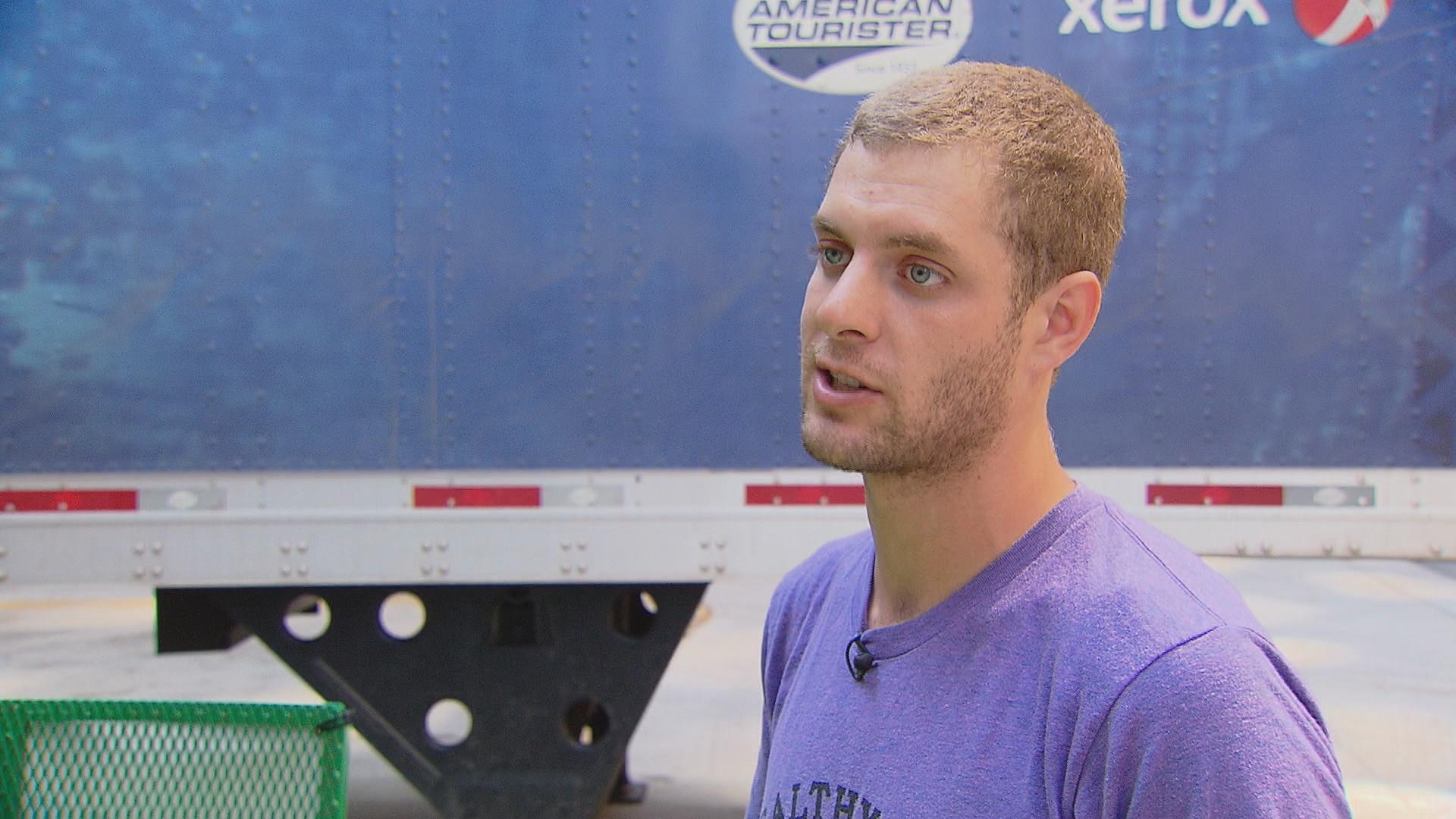 Jonathan Scheffel takes a break at a red light. (Alexandra Silets / Chicago Tonight)