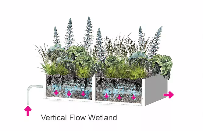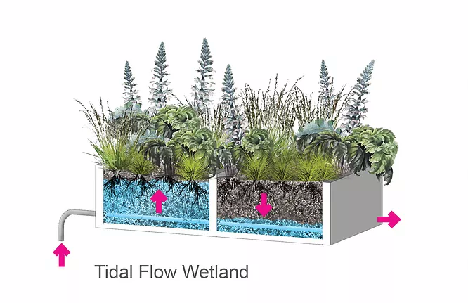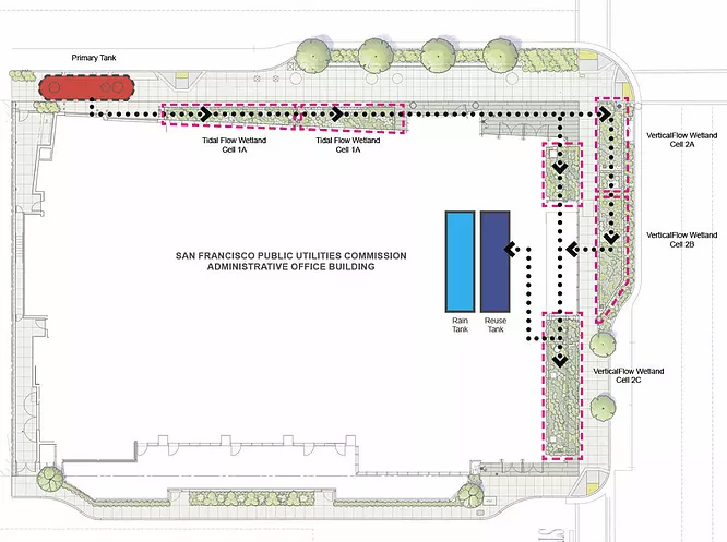 After passing through the first tidal flow wetland cells the water is then pumped into the second stage of vertical flow wetland cells. These cells have a system of perforated pipes that pump the water at regular interval and functions similarly to a sub-surface drip irrigation system. Lastly the water is then pumped into a disinfection tank where the liquid is sterilized with ultra violet light for reuse in non-potable use within the SFPUC building.