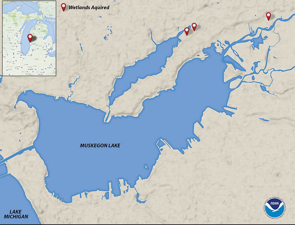 This wetlands purchase supports the NOAA Habitat Blueprint initiative, which identified the Muskegon Lake site as a habitat focus area and directed restoration and water quality improvements.