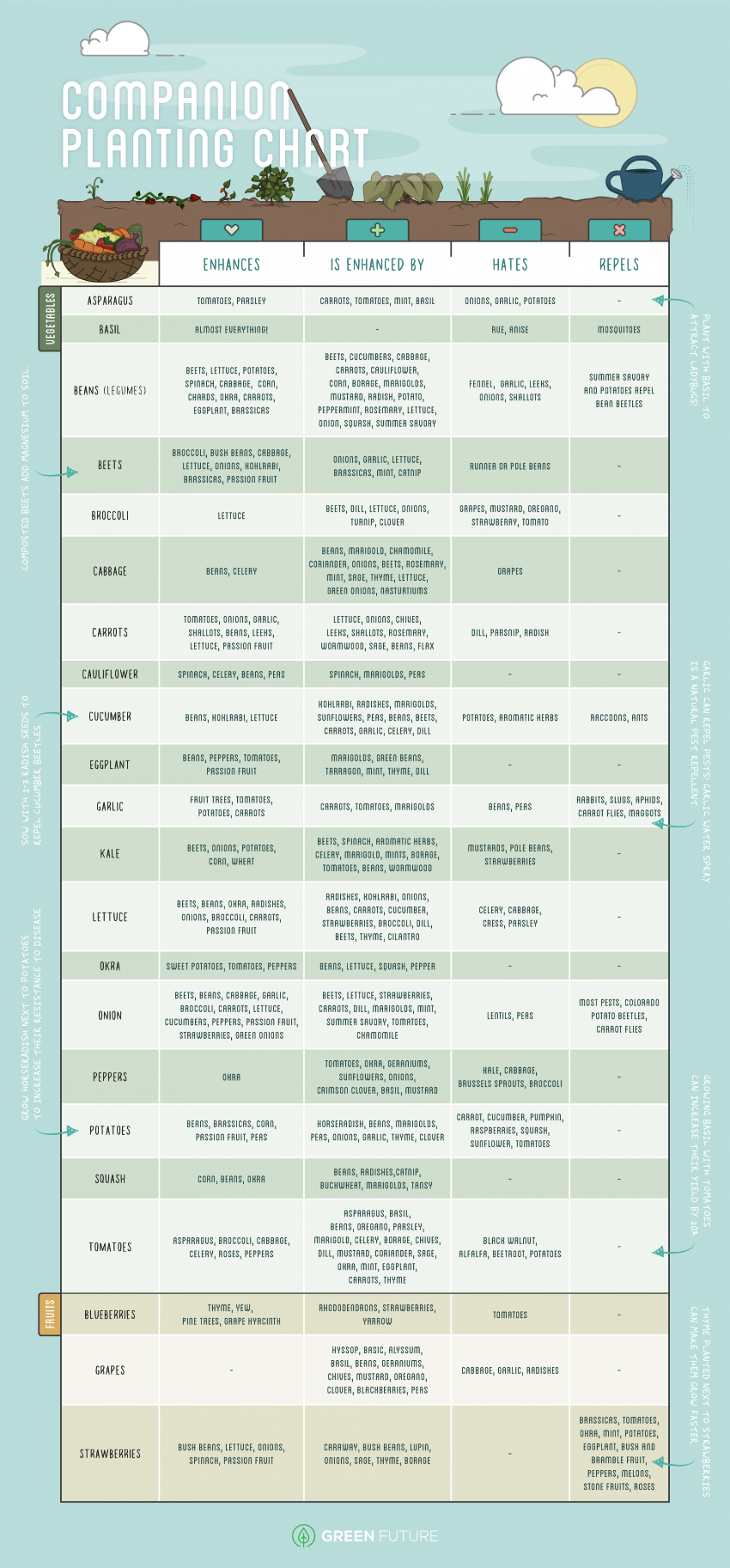 If you have room outdoors, you can use the following infographic to learn about companion planting, and how growing crops together can make them grow stronger and/or more flavorful.