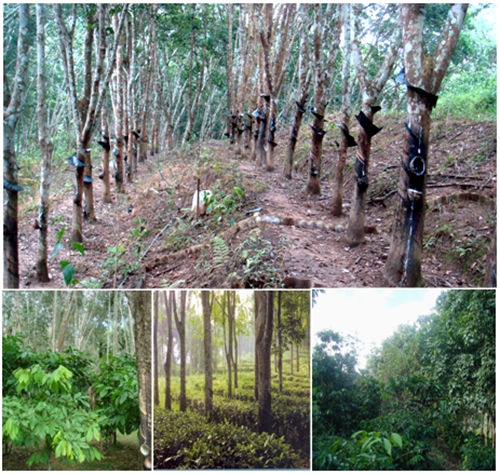 Rubber monoculture (above). Rubber + cocoa, rubber + tea, rubber + coffee agroforestry systems (from L to R, below) (Images by WU Junen)