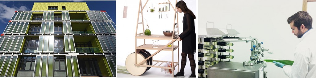 The many biotech applications of Algae…The SolarLeaf project in Hamburg (Left – Source: Arup), Textile-printing with Algal dyes (Centre – Source: Blond & Bieber) and production of Omega-3 dietary alternative to fish (Right – Source: Simris Alg)