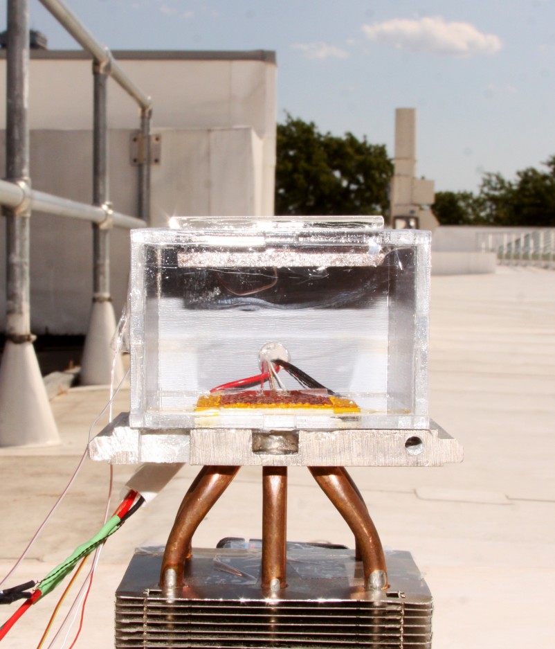 In this case, the scientists employed a previously developed version of the material that Yaghi optimized to efficiently capture water molecules. The prototype bonds with water at night or in shade. But during the day, sunlight hitting the material adds enough energy to convert the water molecules into vapor. In turn, they slip out of the material’s pores and into an adjacent acrylic enclosure. A condenser at the bottom of the vessel collects the water droplets and funnels them into a chamber below, from which clean water can be collected.