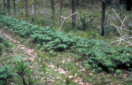 Forest farming is growing and protecting high-value specialty crops under the forest canopy, which is adjusted to the correct shade level the crops prefer. This is done by thinning an existing forest to leave the best canopy trees for continued timber production while creating the best conditions for the understory crop. Non-timber forest products grown using forest farming methods don’t just provide an additional source of income, they also help conserve the species in our landscapes. Photo credit: Jeanie Davis, North Carolina State University