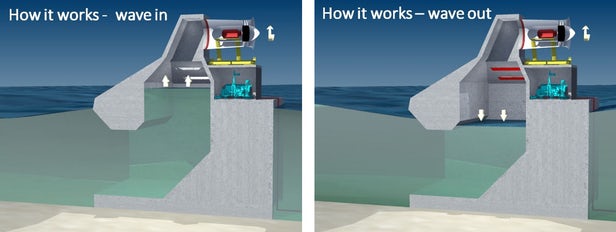 While it sounds somewhat passive, the device uses resonance to make the most energy out of the water that washes into it. The phenomenon can be seen in action in the video below, where the water inside the chamber is higher than the waves on the outside.