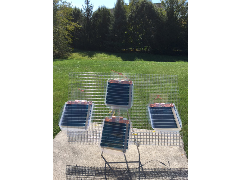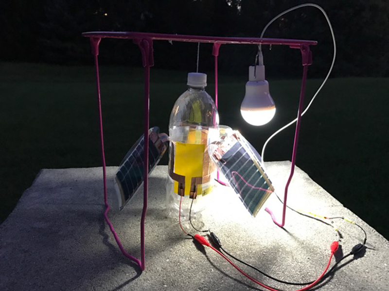 After discussing the practical requirements of a renewable energy source, Mendu decided to integrate flexible solar cells into the device. Now it looks something like a rocket. A plastic water bottle at the center provides the structure, and three wings extend off of it. These mimic the leaves on a tree, vibrating in wind or rain, and powering the piezoelectrics. But now the leaves are made from solar foil, an organic photovoltaic from 3M, which Mendu wired into the same circuit to increase the current. Piezoelectrics are a good source of voltage, but offer little current, and photovoltaics can help supplement that. The piezoelectric harvesters activate in the rain and wind, the solar foil in the sun. The device can hang almost anywhere, and Mendu has successfully charged an iPhone 5, and powered a 15-watt LED bulb.