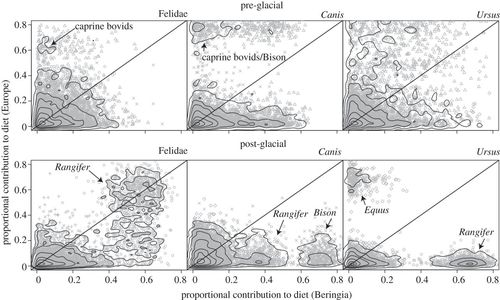 Figure 2. Proportional contribution estimates of prey taxonomic groups to the diets of predators present in both Beringia and Europe in the pre- and post-glacial periods; taxa not present in both localities are not shown. Points represent individual prey-contribution estimates from the Bayesian isotope mixing model, MixSIR (open diamonds, Equus; multiplication symbols, Bison; plus symbols, Mammuthus; triangles, caprine bovids; open circles, Rangifer) and contours show the densities of all points. High-density regions correspond to the most likely predator–prey link-strengths; if the high-density region for predator–prey pairs falls on the 1: 1 line, then the proportional contribution of prey to predator diets does not change from Beringia to Europe. Notable high-density regions corresponding to specific prey are labelled in each plot.