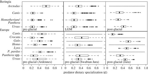 Figure 3. Predator dietary specialization (ɛ) for Beringian and European predator species from the pre-glacial to the post-glacial. A value of ɛ = 0 describes a generalist diet (consumption of all prey in equal amounts), whereas a value of ɛ = 1 describes a specialist diet (consumption of one prey to the exclusion of others). ɛ-values for Homo were calculated using a 4.5‰ trophic discrimination factor. Dotted lines denote species’ absence.