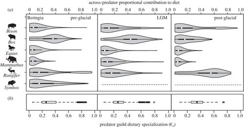 The degree of dietary specialization can be used to summarize consumer dietary strategies, and is a useful metric for comparing consumer populations over both space and time [16]. We calculated dietary specialization for predators in each mammoth steppe predator–prey community (figure 3). Dietary specialization (ɛ) ranges from 0, where all prey are consumed in equal proportions (dietary generalist), to 1, where one prey is consumed to the exclusion of all others (dietary specialist; see electronic supplementary material, appendix S5). We determined Arctodusto be a specialist predator in Beringia (particularly in the pre-glacial; ɛ = 0.58; this and hereafter are median values), relying primarily on either Rangifer or Symbos in the pre-glacial, and switching to Bos during the LGM (ɛ = 0.35; electronic supplementary material, figure S1). Ursus, by contrast, was a generalist in the pre-glacial and LGM (pre-glacial, ɛ = 0.22; LGM, ɛ = 0.23), but after the extinction of Arctodus adopted a more specialized diet on Rangifer in the post-glacial (ɛ = 0.42). Canis and both Beringian felids had generalist diets spanning the entire time interval (Canis: pre-glacial, ɛ = 0.24; LGM, ɛ = 0.23; post-glacial, 0.32; felids: pre-glacial, ɛ = 0.22; LGM, ɛ = 0.23; post-glacial, 0.28).