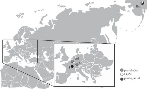 Figure 1. Locations of Late Pleistocene mammoth steppe sites included in the analysis. The pre-glacial, LGM and post-glacial Beringian sites are located near Fairbanks, Alaska. Two pre-glacial and one post-glacial European site occur in eastern France, Belgium and western Germany, respectively. Ber., Beringia; Ard., Ardennes; SJ, Swabian Jura; J, Jura.