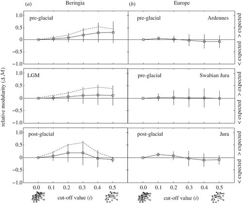 Figure 5. Relative modularity for (a) Beringia and (b) Europe across cut-off values i. Values > 0 indicate that the system is more modular than is expected given the size and predator: prey ratio of the network; values < 0 indicate that the system is less modular than is expected. For Beringian systems, dashed lines denote median relative modularity values if a trophic discrimination factor of 4.5‰ is considered. The cut-off value i = 0 refers to the whole network with no link deletions. At high cut-off values, only the strongest interacting species affect the structure of the network.