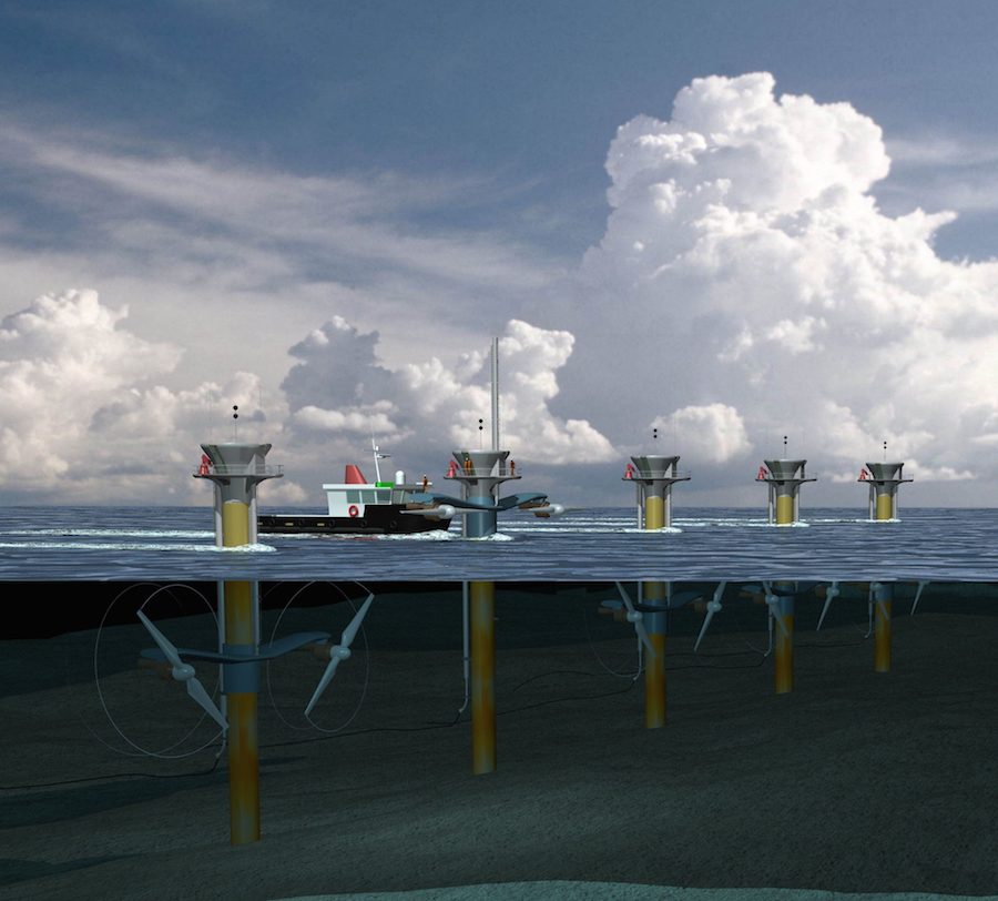 Tidal turbines harness marine currents and tidal energy using tidal stream turbines that work much like submerged windmills, but are driven by flowing water rather than by air. Marine Current Turbines
